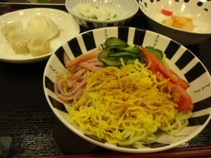 内容は 中華粥 冷やし中華 エビシュウマイ? プチ肉まん