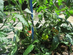 左は5月後半には緑だった黄色のミニトマトが6月には黄色いトマトの実が1つになりまし