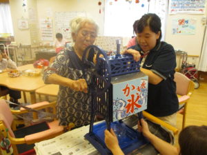 夏祭りの屋台にあるかき氷機を使用し、皆さんとワイワイ作りました??