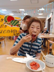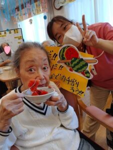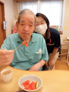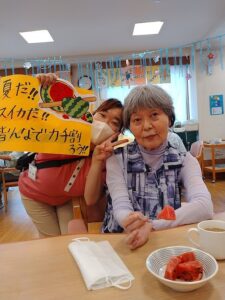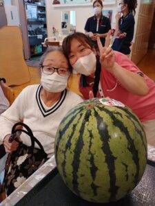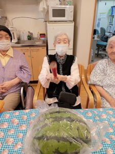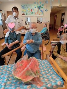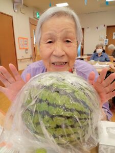 スイカを食べて、この暑さを一緒に乗り越えましょうね。![]()