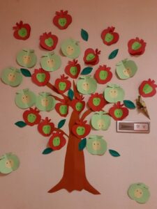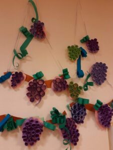 他にも画用紙を丸めて、ブドウ作り画用紙を貼り合わせてリンゴの木