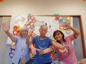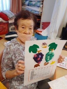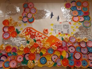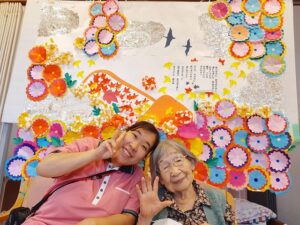 リボーンデイでは秋の飾りつけを皆さんと作り、飾っています壁面は紅葉山を囲むように、色とりどりの菊の花で飾り付け
