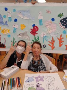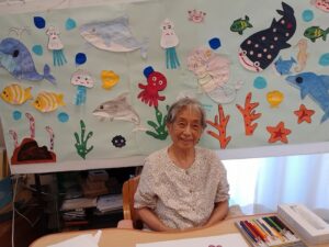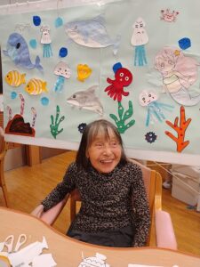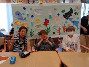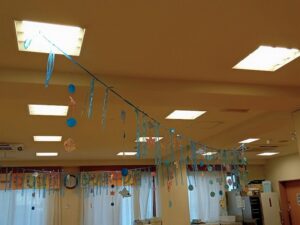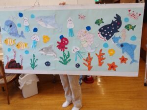 7月末に皆さんがお手伝いして下さった「水族館」の壁面とガーランドが出来ました。👏