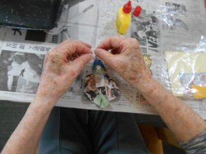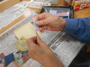 ちりめん紙で髷(まげ)を作り衣装を着せた紙人形?皆様子供の頃を思い出されながら熱心に作業されていました?