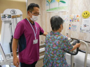 リゾールに新しい仲間がふえました 機能訓練士のHさんです。 経験豊富で頼りがいのある訓練士さんです 日常生活を送るために必要な基本動作を向上・維持・改善のお手伝いをしてくれます。