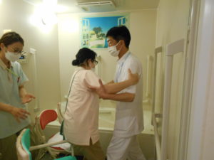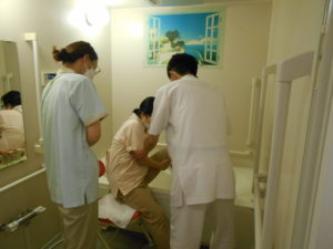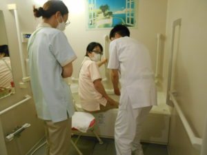 リゾールの浴室にて研修風景 写真は【介護士 機能訓練指導員】です
