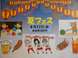🌻8月22日(金)に夏フェスを開催します🌻 生演奏、縁日等お楽しみがいっぱい(^^♪ 屋台も出まーす😊 お申し込みはお早めに。皆様のご参加お待ちしております🍀