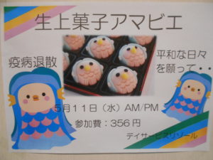 ?来週のお楽しみスイーツは疫病退散妖怪アマビエちゃんの和菓子を提供致しますのでお楽しみにしていてくださいませ?