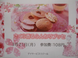 そして来週21日月曜日にはおやつの時間にさくらのブッセのご提供をさせて頂きますので皆様お楽しみに??