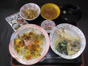 三月三日の昼食はてんぷらにちらし寿司でした。