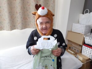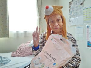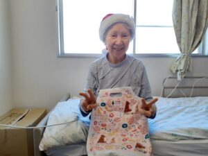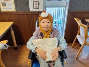 お渡して、一緒に仮装し写真撮影をしております。遠方のご家族様にも元気におられる様子を