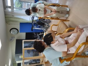 腹部突き上げ法(ハイムリック法)と背部叩打法をスタッフ同士で交互に行い、もしもの時、介護職員が迅速かつ冷静に対応できるように実施しております。