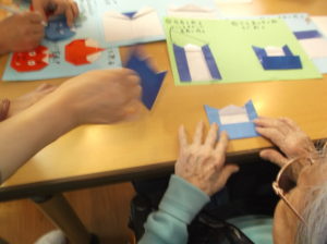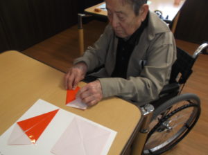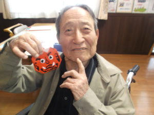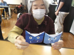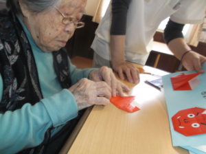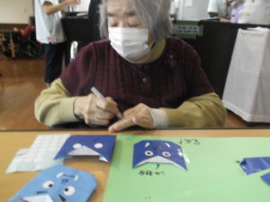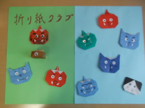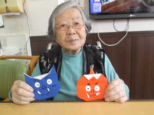 前回に引き続き、折り紙教室です。節分にちなんでみんなで鬼?を折り、仕上げました‼