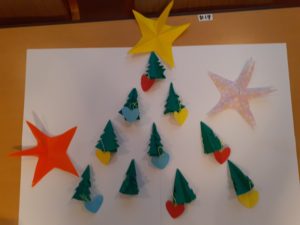 クリスマスツリー作りは、小さなもみの木を15個と、ハートの飾りを作り画用紙に貼って飾りました。