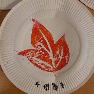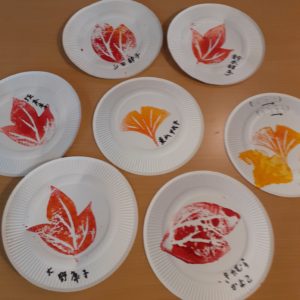 スタッフ手作りのもみじやイチョウの葉っぱのハンコを、紙皿に押して作品にしました。