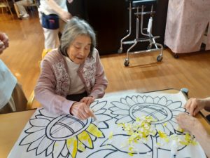 折り紙を細かくちぎり、のりで貼っていく細かい作業でしたが、