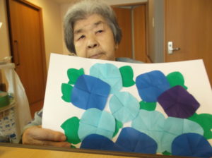 緑の葉っぱも折り紙で、沢山折った朝顔、葉っぱを画用紙に貼り