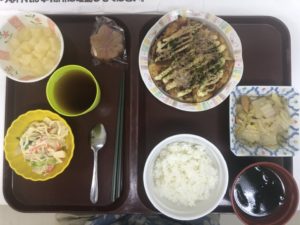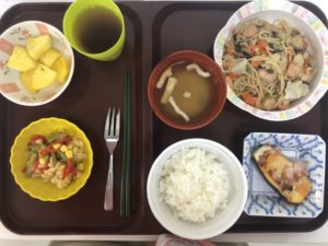 ☆メニュー?ご飯・みそ汁・海鮮焼きそば・なすPizza・野菜サラダ・パイナップル