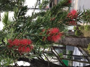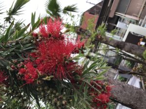 エントランスで咲き始めたブラシの木(カリステモン)も雨に打たれていますが