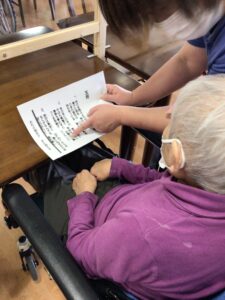 食堂に集まっていただき歌や楽器、リズム体操など楽しんでいただいています。