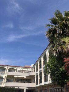リゾート地をイメージして建てられているので、初夏の青空に映える施設です