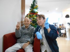 クリスマスツリーをバックに?