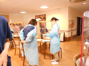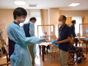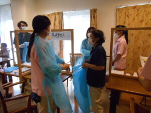 また、ガウンテクニック(PPE)の仕方をみんなで実際に行いながらチェックをお互いに行いました。