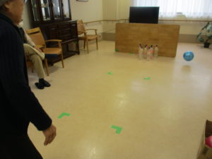 大きいペットボトルを並べて、ゴムボールを投げます?