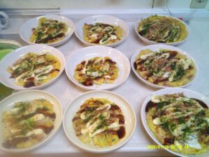 お好み焼きソースやマヨネーズをたっぷり掛けて、