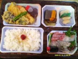 ご飯や刺身や天ぷら等が入っているお弁当です。