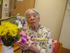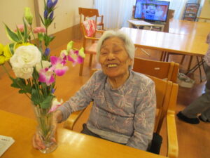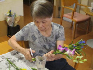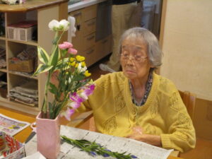 1. リンドウ (Gentiana) 2. スプレーカーネ (Spray Carnation) 3. デンファレ (Denfare) Mokara Dendrobium) 4. トルコキキョウ (Toruko Kikyou) 5. スプレーマム (Supurē Mamu) 6. ドラセナ (Dorasena) 今日は施設でお花を生けるイベントがありました。 完成した花瓶を見て、自然と笑顔があふれ、とても和やかな時間になりました。