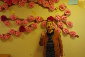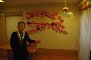当日は大雨の為、フロアの「壁絵」の桜でお花見気分を味わって頂きました。
