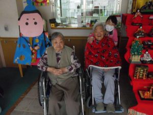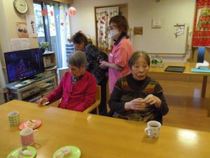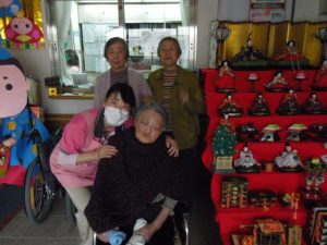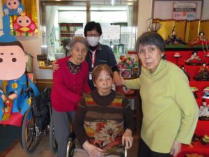 おやつの後は、1階のフロアに飾られているひな人形と一緒に記念撮影を撮りました?