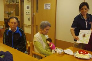 職員手作りの「苺ケーキ」にて、お祝いしました。