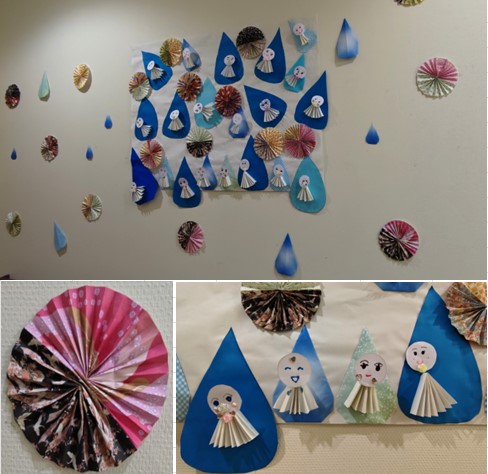 ☆トイレ前ギャラリーには、てるてる坊主&傘を飾りました