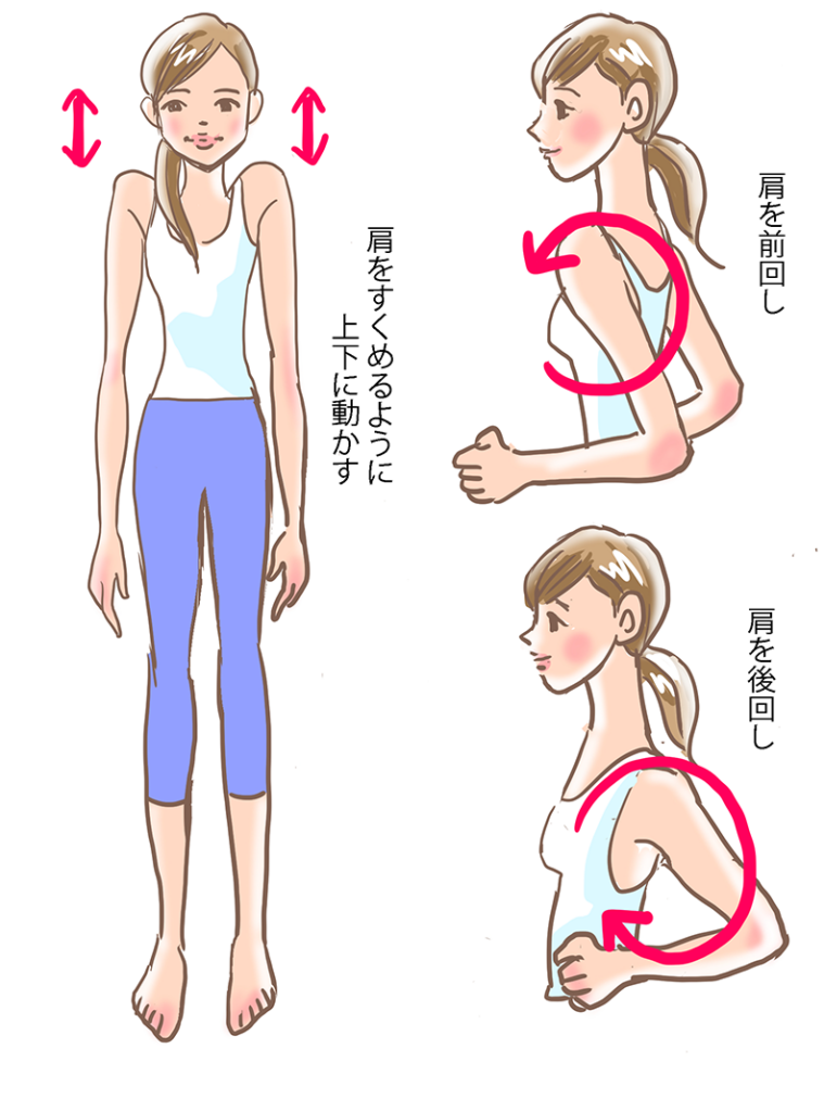 肩甲骨回し(肩上げ6回程度、肩回し3回程度ずつ)