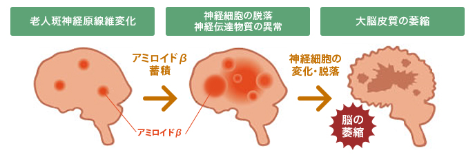アミロイドβが脳神経に溜まっていき、海馬(脳の中でも記憶に関わるところ)が委縮していく。そこから徐々に広がっていくと言われている。