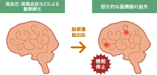 脳梗塞や脳出血などが原因で発症します。血管がつまり血流が不足している領域の神経細胞の機能が失われたり、出血によって溜まった血流に脳が圧迫されたりすることで様々な症状が現れると言われています。