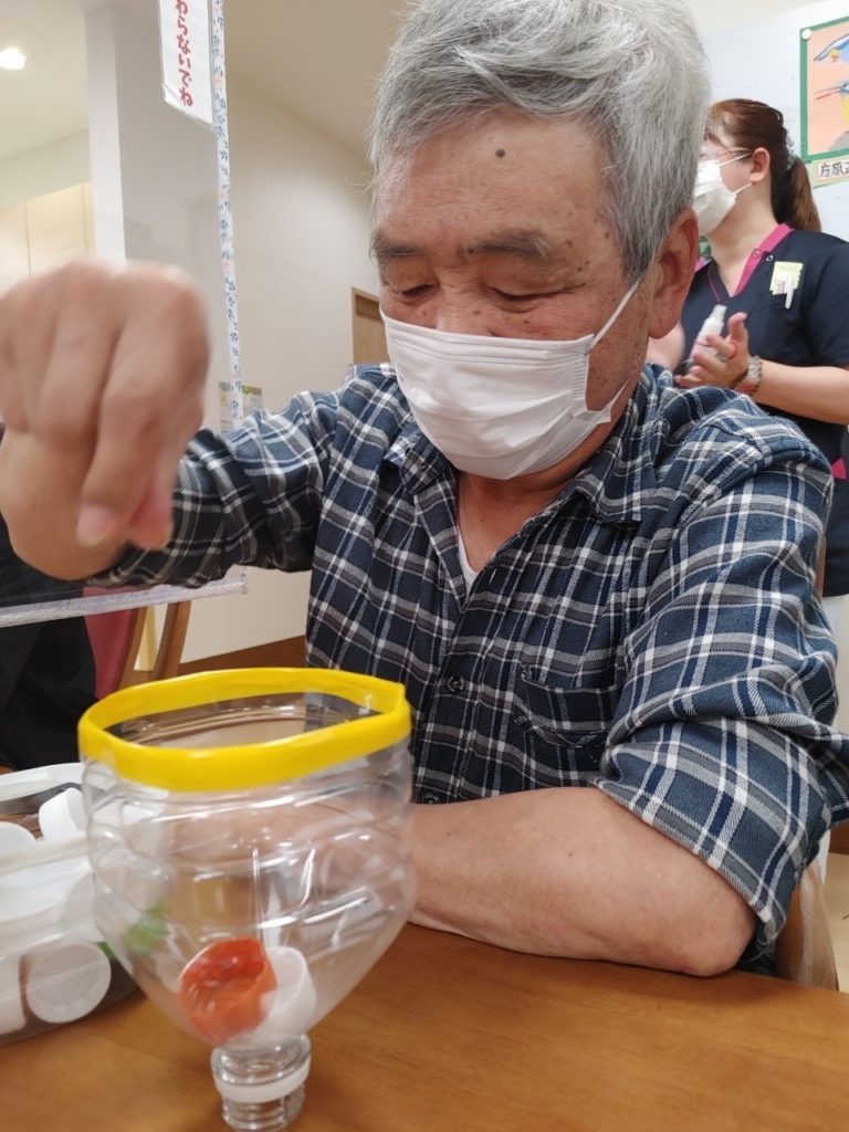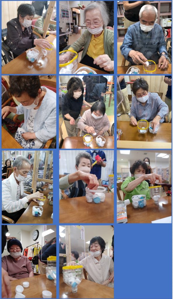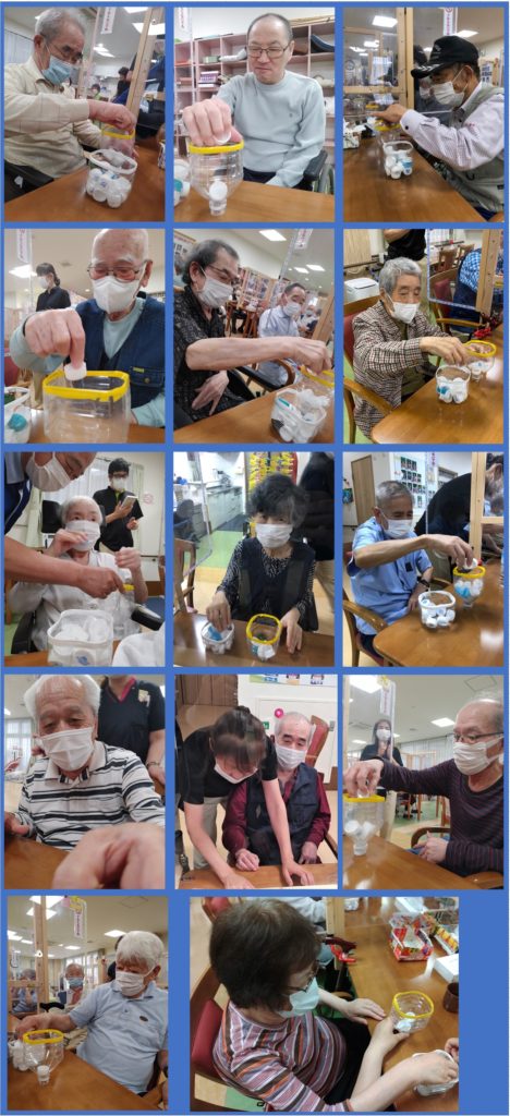 その中に、15秒間に何個ペットボトルのキャップを入れることができるか?