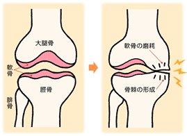 そして、大腿骨と脛骨の隙間が狭くなり、次第に隙間がなくなっていきます。それに伴い、関節が変形し、痛みが出現する状態を変形性膝関節症と言います。