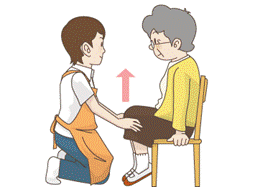 椅子に浅く座り、膝を曲げたまま両膝をゆっくりあげて、2~3秒キープする。できなければ、片脚ずつ行う。膝と胸をくっつけるイメージで足をあげ、腹筋を鍛える。