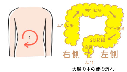 便秘解消のための代表的なマッサージ。大腸の形に沿って「の」を書くように刺激をしていく。親指以外の4本を重ねて、おへそ回りをゆっくり時計回りに刺激をしていきましょう。マッサージの際は、滑りがよくなるようにクリームやオイルをなどを使用してもかまいません。回数はお好みで!!