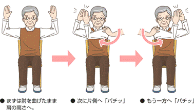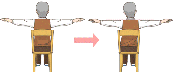 背筋を伸ばしながら、両手を平行に開けて腰から上を右にずらし、2~3秒してから体を戻す。また同じように左側も実施する。もし、手が上がらない場合は下ろしてやっても大丈夫。この時、肩が下がらないよう注意して下さい。