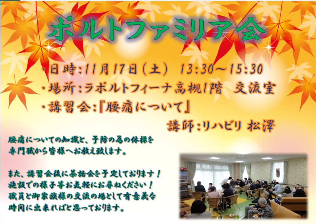 来たる11/17(土)に開催予定のポルトファミリア会の講習会にて『腰痛について』のお話が聞けるんです‼?