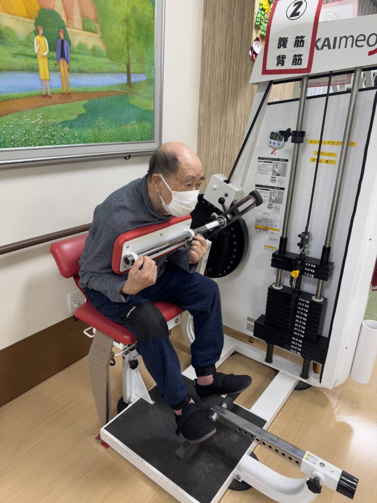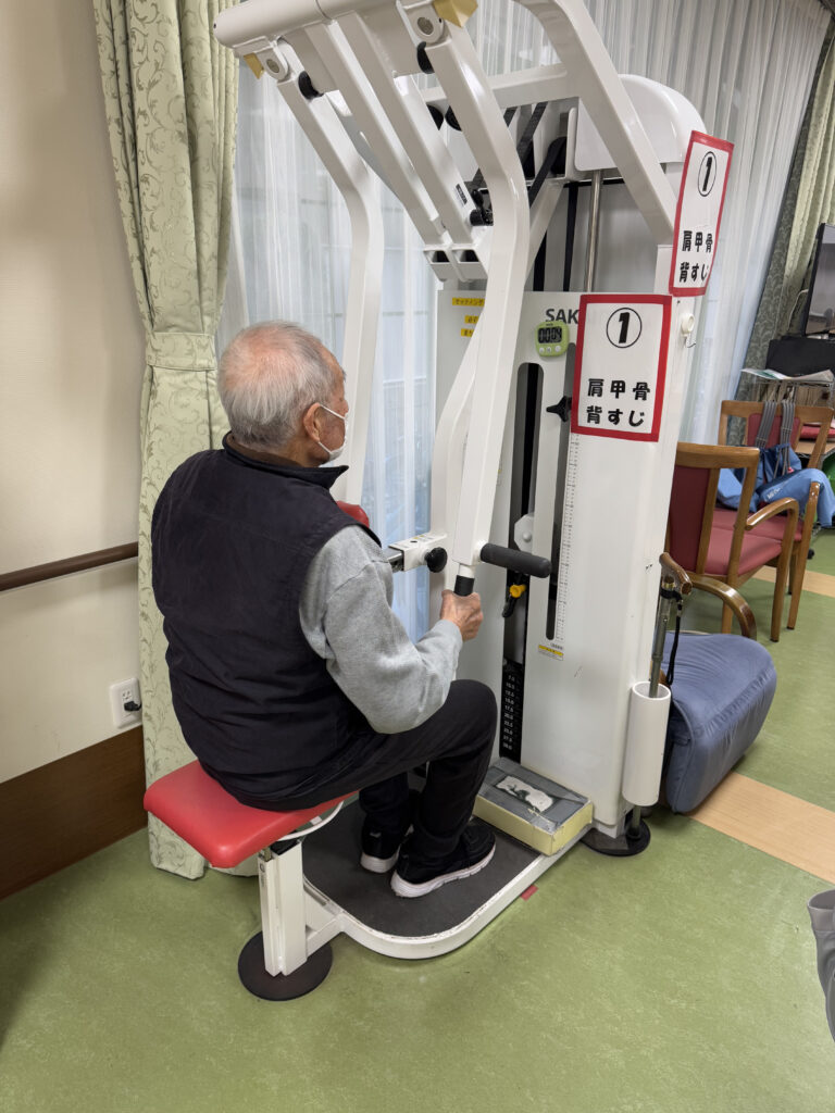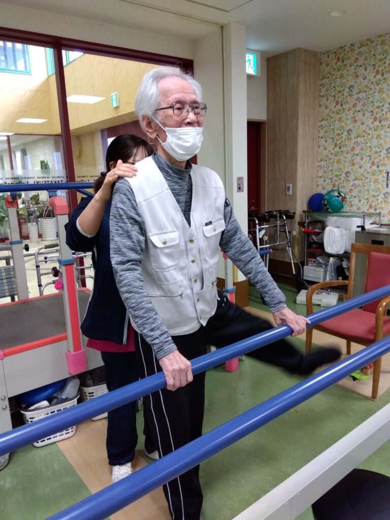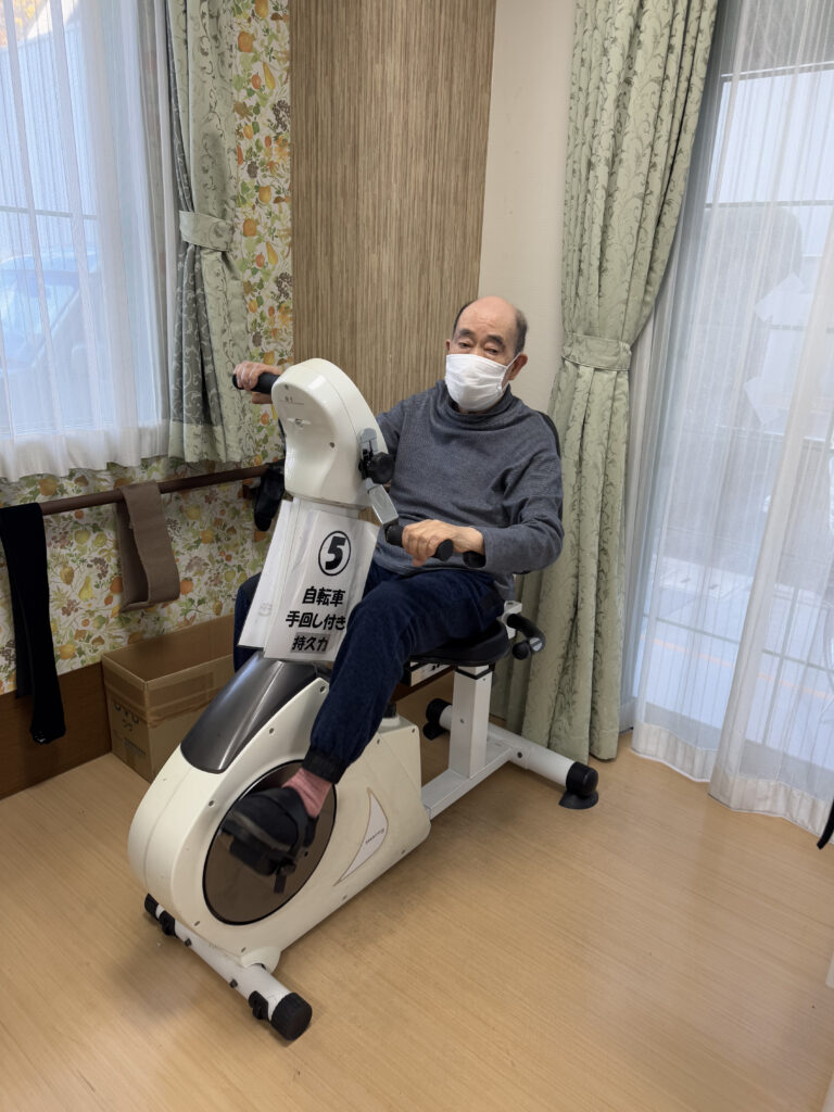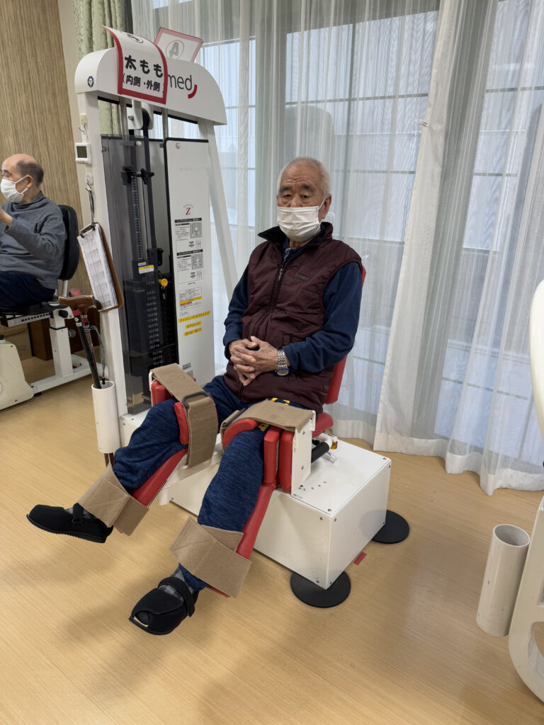 個別リハビリだけではなく、下肢筋力や持久力の向上を図るため、リハビリスタッフが評価をしてゲスト様に合ったメニューで行って頂いています。