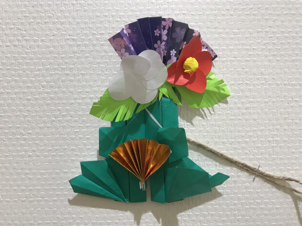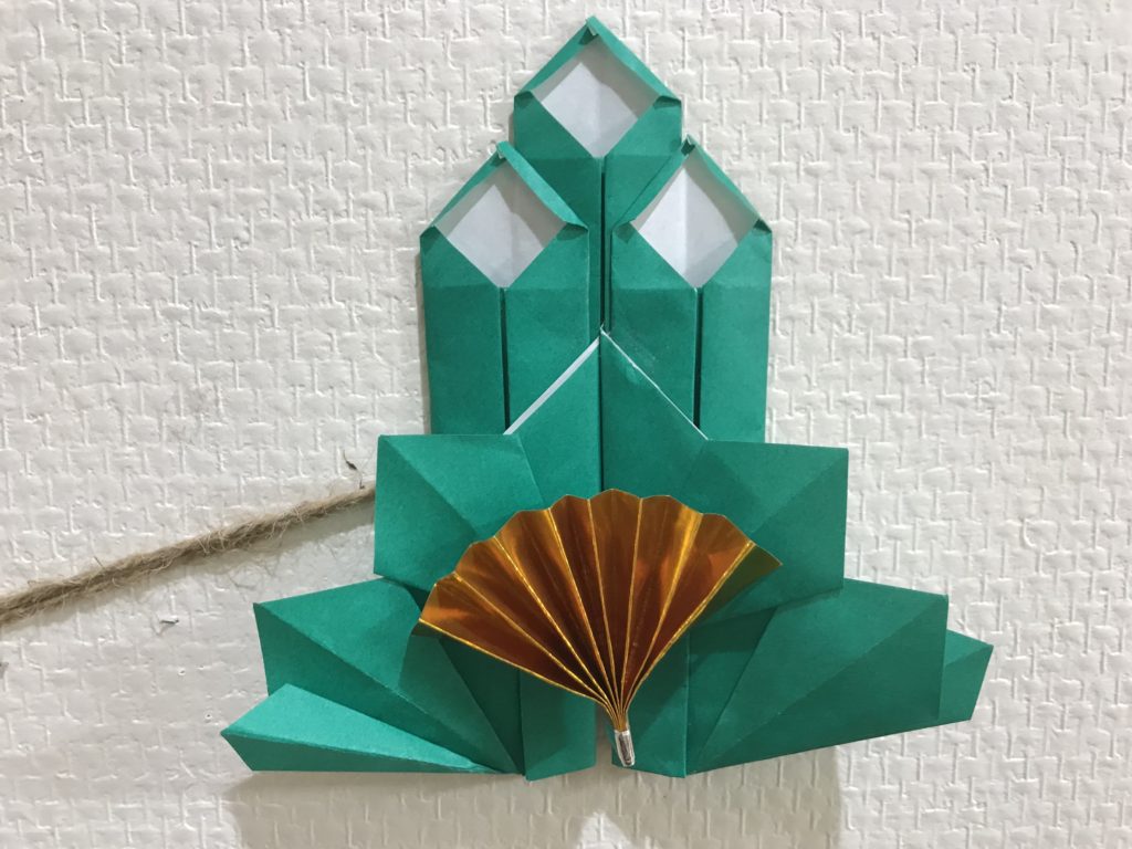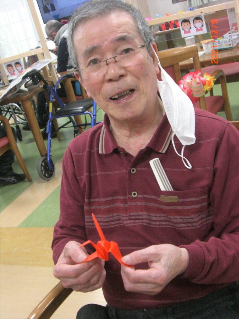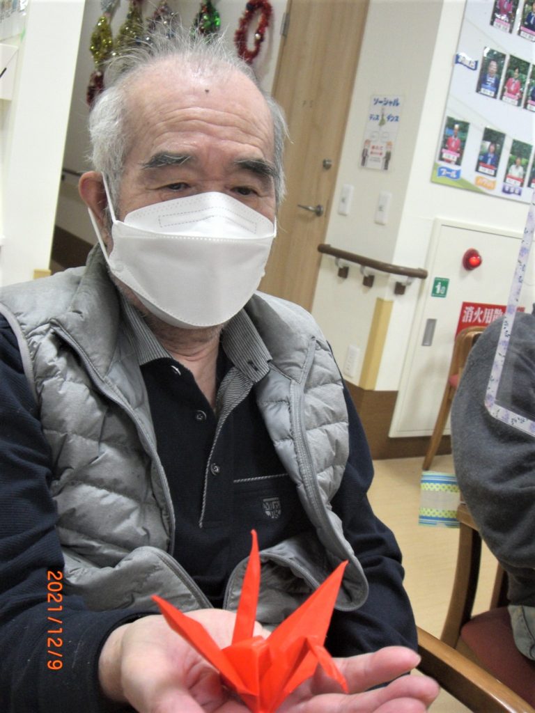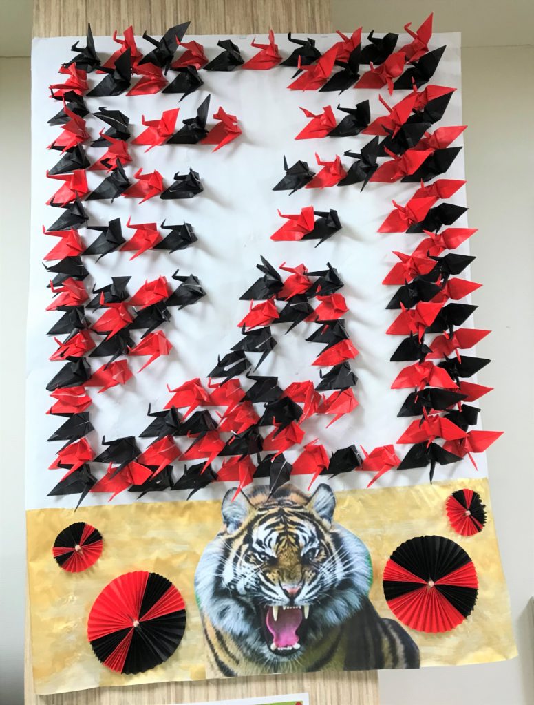 黒と赤の鶴を折って頂いて上の写真のように“寿”に見えるように