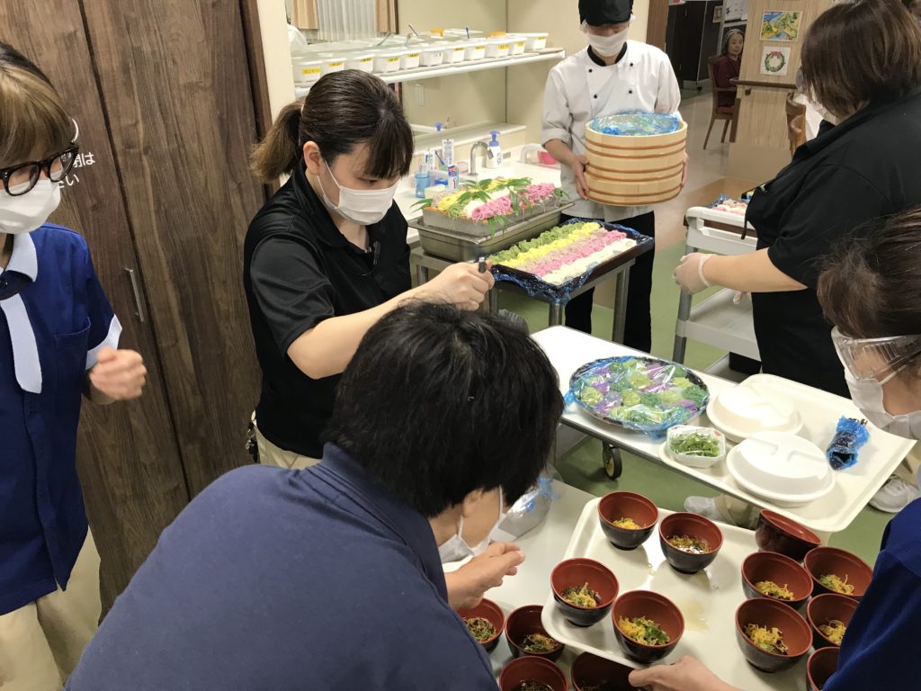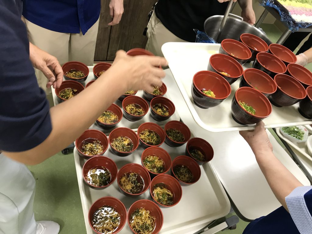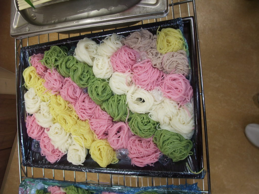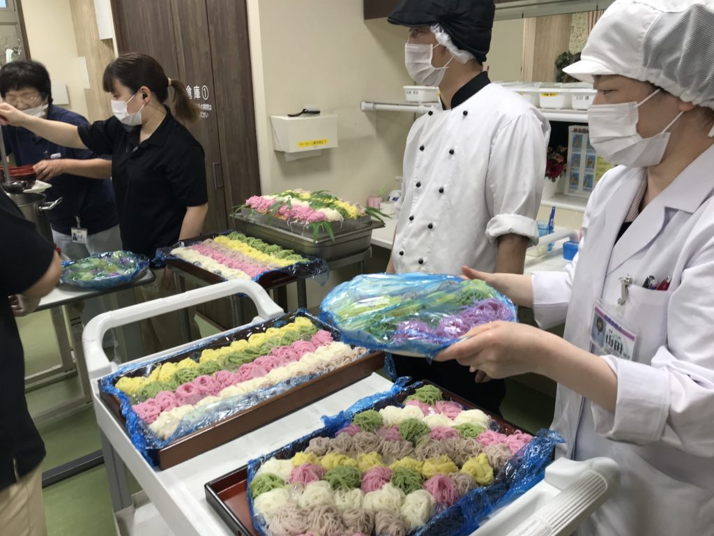 さて老健では、七夕なので素麺のおやつレクをしました? 色々な色の素麺をご用意?