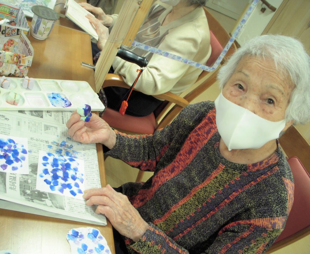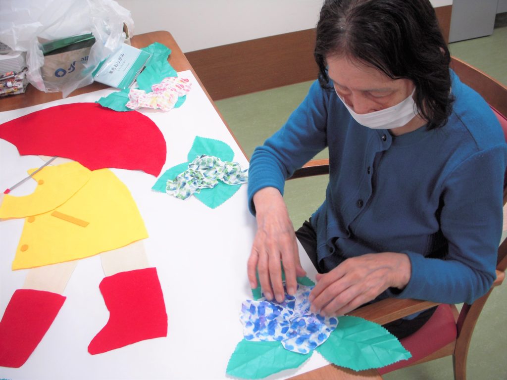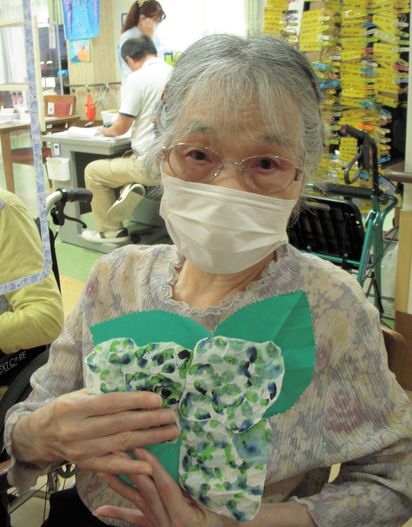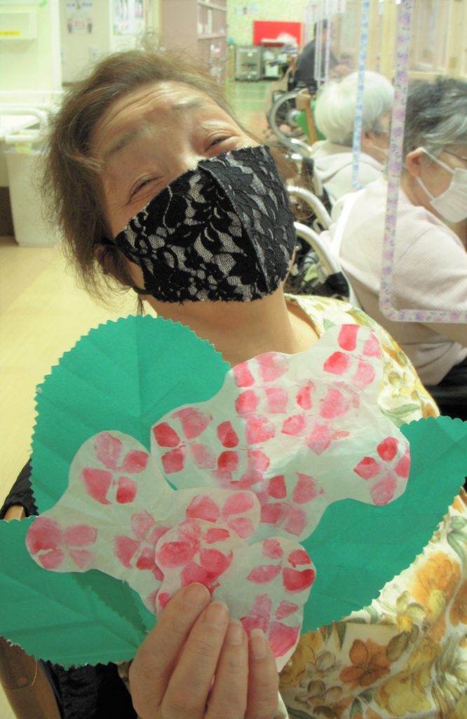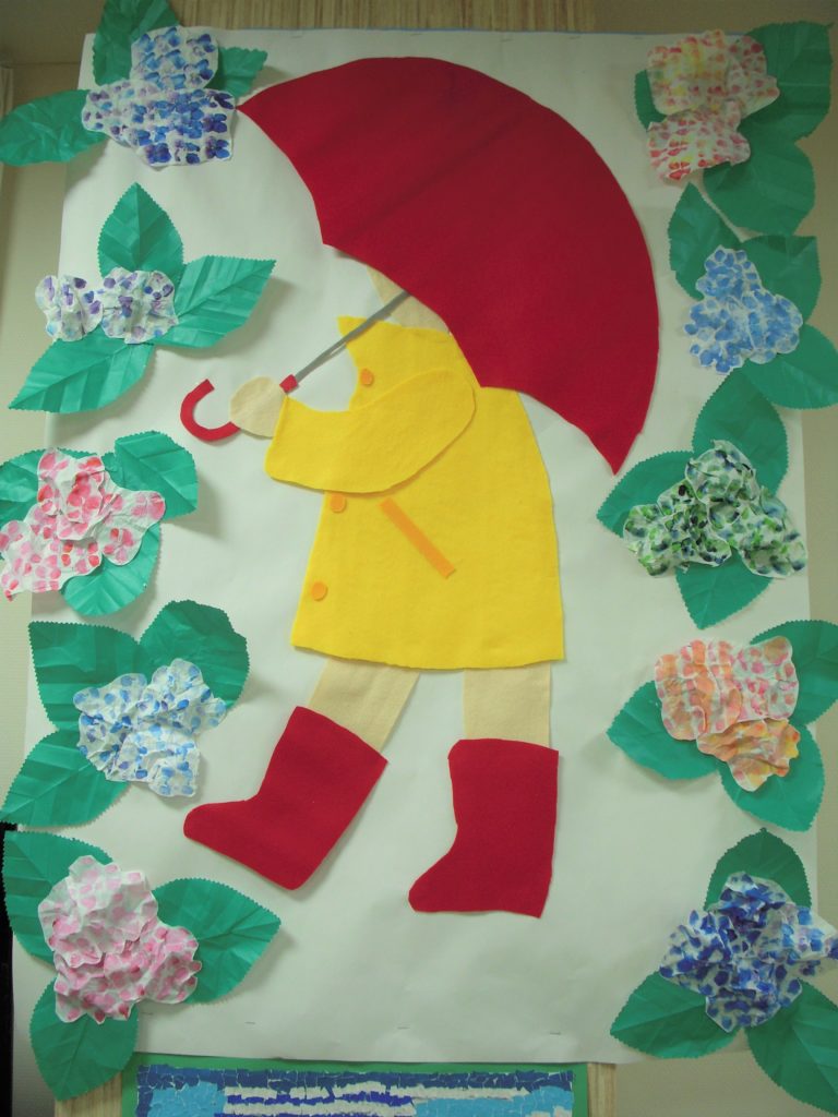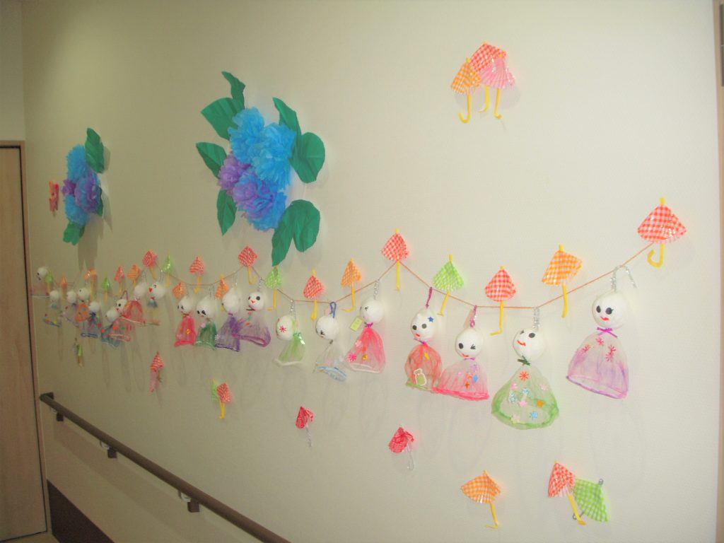 ラ・ポルトフィーナ高槻デイケアの5月の壁画は紫陽花&てるてる坊主でした。
