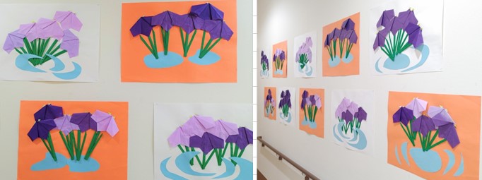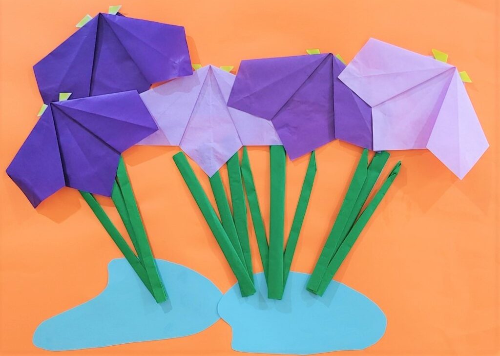 紫色や薄紫色の折り紙で、菖蒲を折りました。