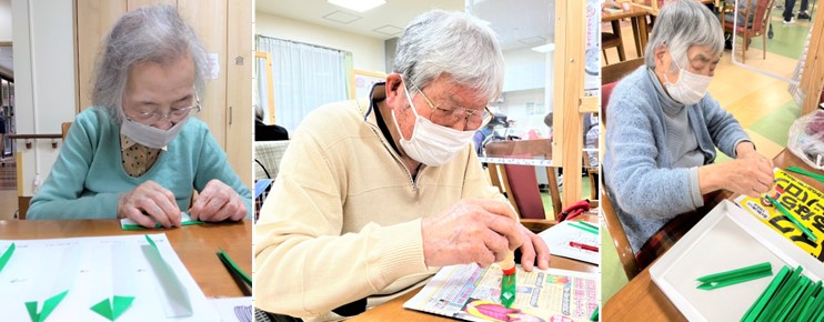 茎も緑の折り紙で、折って、貼って、切って・・・